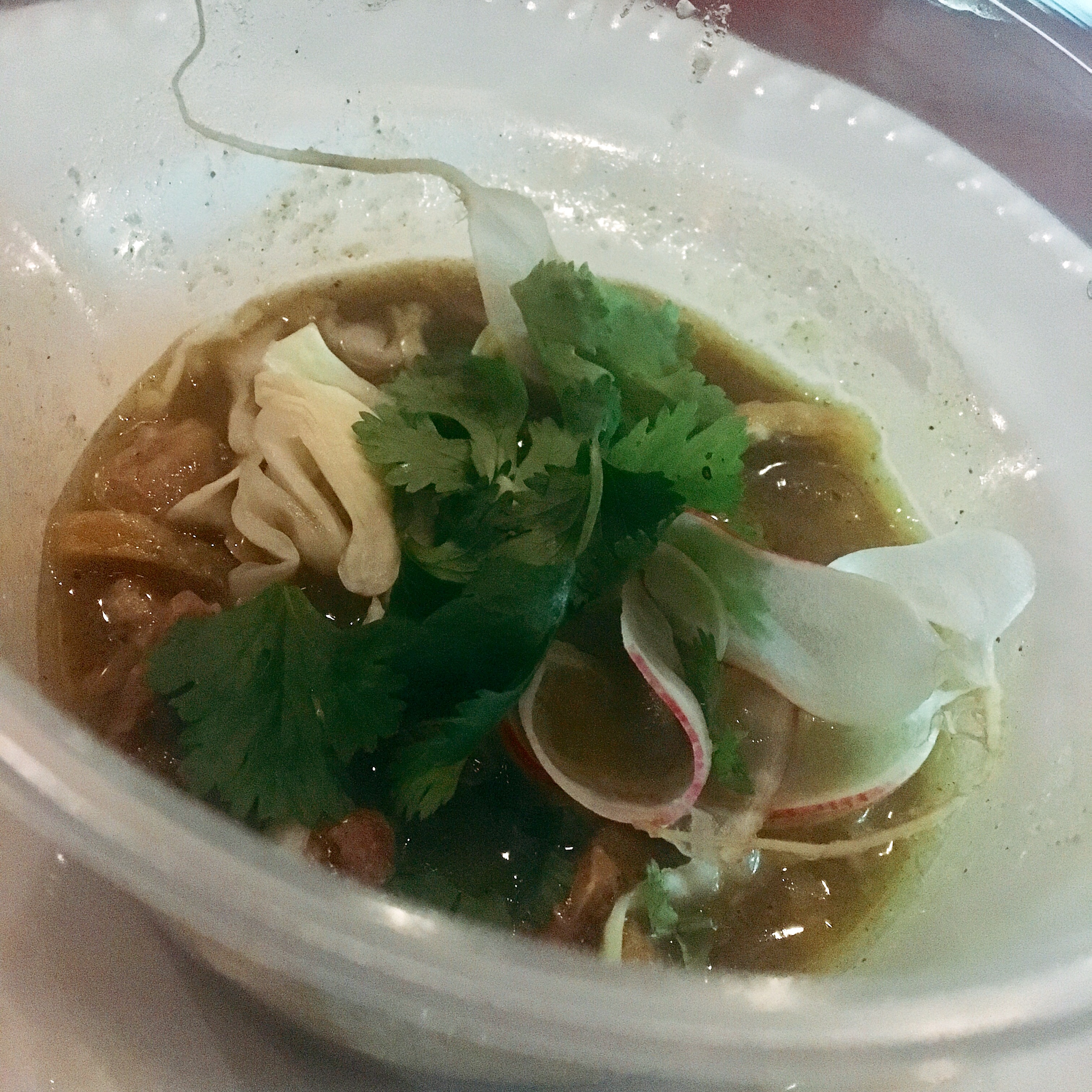 –ย  Pork posole verde, guajillo crema, cabbage, serranos, and radishes