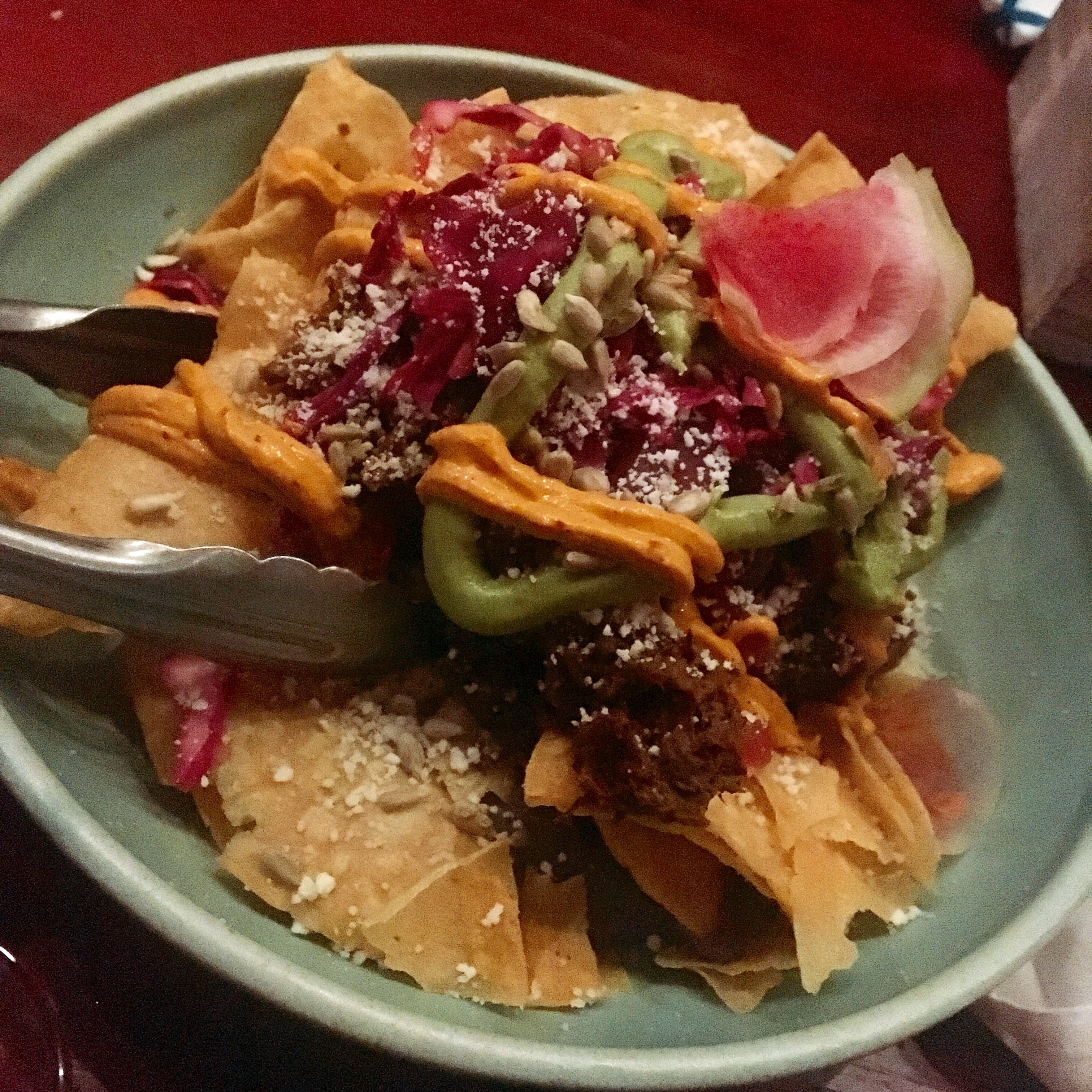 –ย  Barbacoa tostadas, avocado, cotija, sunflower seeds, pickled onions