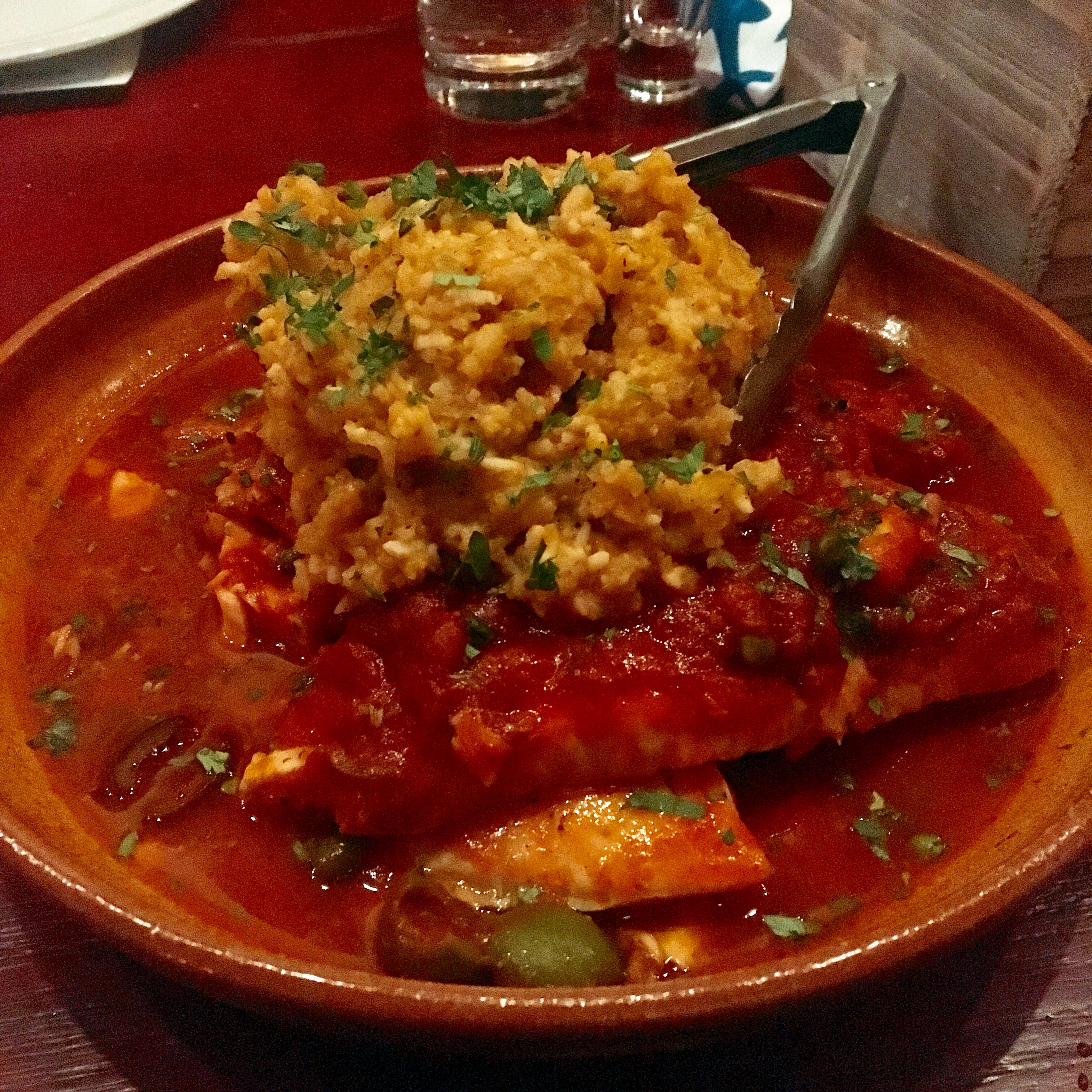 –ย  Tilapia a la Veracruzana, tomato sauce, capers, olives, Spanish Rice